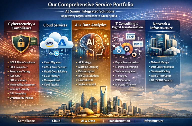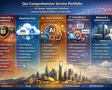 At Samur Integrated Solutions, we deliver end-to-end digital excellence tailored to the unique regulatory and technical landscape of Saudi Arabia. Our specialized silos are designed to empower your organization with resilience, scalability, and innovation.